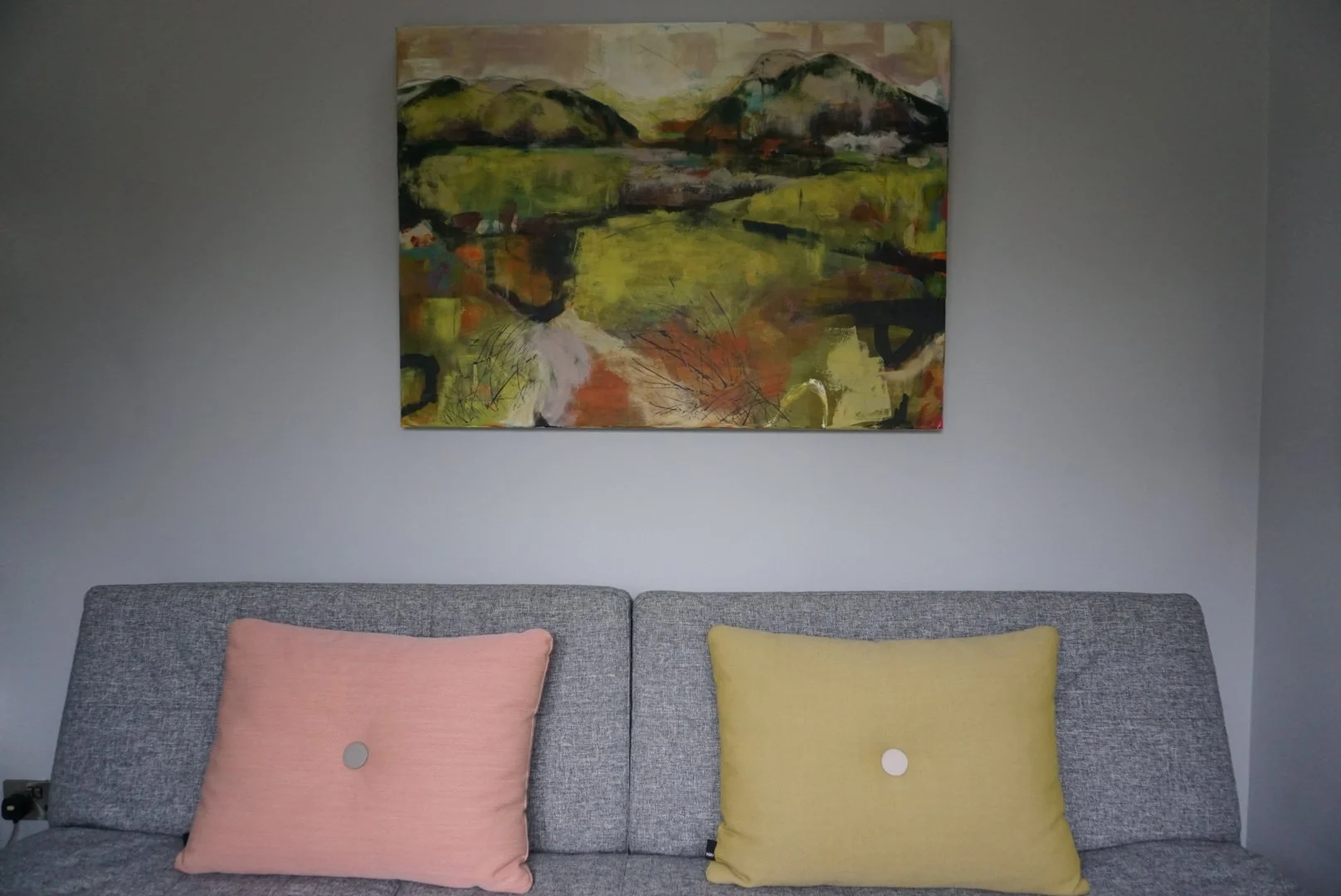 “Bring Me Sunshine is an acrylic/mixed media and oil and cold wax medium work. A beautiful abstract, vibrant piece taking centre stage in our newly built extension. Never fails to make us smile, especially on a bright, sunny day!”